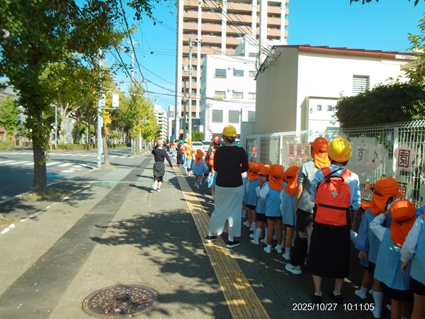 防災頭巾を被って和歌山信愛中高まで避難する練習をしたよ。